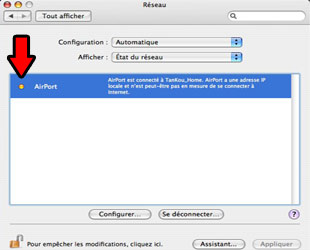Vérifiez que votre connexion est opérationnelle : cliquez sur le menu Pomme (en haut à gauche), puis sur Préférences système. Une nouvelle fenêtre s'ouvre, double cliquez sur Réseau. La nouvelle fenêtre devrait afficher un bouton de couleur verte à côté de l'AirPort.