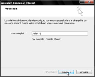 Entrez ensuite votre nom ou le pseudonyme de votre choix. Cette option est importante car il s'agit du nom/pseudonyme qui apparaîtra dans les messages que vous enverrez. Une fois le nom choisi, cliquez sur Suivant.