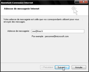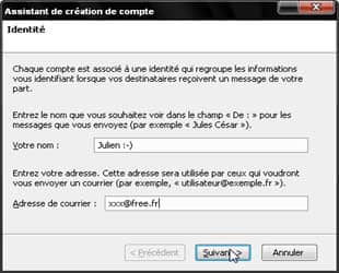 Entrez votre nom ou le pseudonyme de votre choix (champ Votre nom). Cette option est importante car il s'agit du nom/pseudonyme qui apparaîtra dans les messages que vous enverrez. Entrez dans le champ Adresse de courrier le login précédemment créé, suivi de @mail.lpconnect.fr. Cliquez ensuite sur Suivant.
