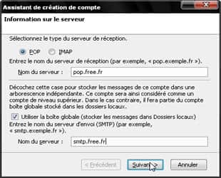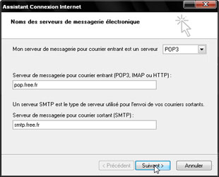 Entrez les paramètres serveur : pour le courrier entrant tapez pop.mail.lpconnect.fr, et pour le courrier sortant smtp.mail.lpconnect.fr, comme indiqué sur l'illustration. Cliquez ensuite sur Suivant.
