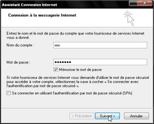 Saisissez votre login et votre mot de passe. Vous pouvez également choisir de mémoriser le mot de passe pour éviter d'avoir à le saisir à chaque relevé du courrier. Cliquez enfin sur Suivant , puis sur Terminer.