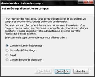 Lors du lancement du client, une fenêtre Assistant de création de compte apparaît. Sélectionnez Compte courrier électronique, puis cliquez sur Suivant.