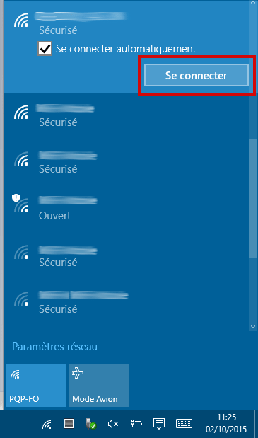 Si l'équipement WiFi de votre ordinateur est bien installé (se référer à la notice de votre ordinateur) et géré par le système Windows, une icône de connexion au réseau sans fil doit être présente en bas à droite de l'écran, à côté de l'horloge. Cliquez dessus avec le bouton droit de la souris, puis cliquez sur Afficher les réseaux sans fil disponibles. Windows effectue une recherche des réseaux à portée et vous en propose une liste. Sélectionnez votre nom de réseau et cliquez sur Connecter.