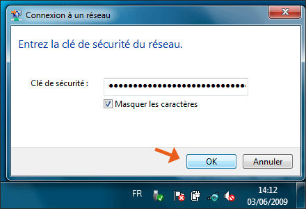 La fenêtre suivante apparaît. Renseignez votre clé de sécurité Wi-Fi et cliquez sur OK (vous pouvez décocher la case Masquer les caractères pour afficher la clé WiFi et être certain de ne pas faire d'erreur)
