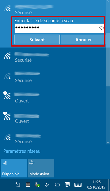 La fenêtre suivante apparaît. Renseignez votre clé de sécurité Wi-Fi et cliquez sur OK (vous pouvez décocher la case Masquer les caractères pour afficher la clé WiFi et être certain de ne pas faire d'erreur)
