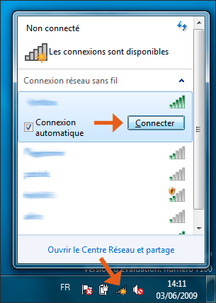 Si l'équipement WiFi de votre ordinateur est bien installé (se référer à la notice de votre ordinateur) et géré par le système Windows, une icône de connexion au réseau sans fil doit être présente en bas à droite de l'écran, à côté de l'horloge. Cliquez dessus avec le bouton droit de la souris, puis cliquez sur Afficher les réseaux sans fil disponibles. Windows effectue une recherche des réseaux à portée et vous en propose une liste. Sélectionnez votre nom de réseau et cliquez sur Connecter.